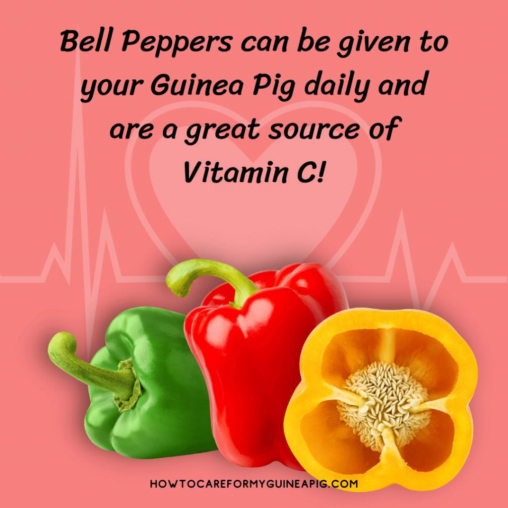 Bell Pepper (also called Capsicum annuum) is a nutritious vitamin C rich vegetable perfect for your Guinea Pigs! You can give them Red, Yellow, and Green Bell Peppers every day. This is a staple veggie in our house.