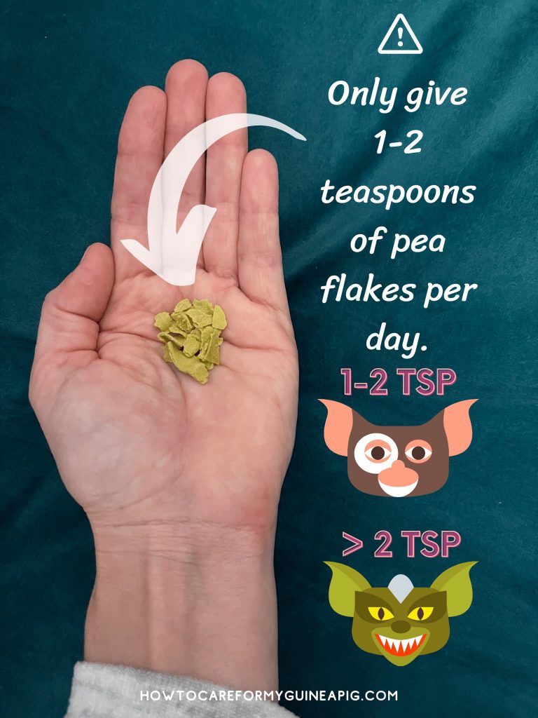 Treats like pea flakes should only be given 1-2 teaspoons per day max due to their high protein content. The serving size for one Guinea Pig looks about like what’s in the palm of my hand.